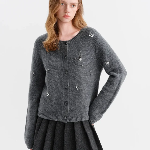 This vintage-inspired wool knit cardigan is designed for women who love soft textures, refined details, and effortless winter style. Made from 100% pure sheep wool, it delivers natural warmth and breathability while remaining comfortable for everyday wear. The delicate beaded embellishments add a subtle sparkle that elevates your look without being overpowering. With its clean round neckline and single-breasted front, this sweater balances classic charm with modern simplicity.