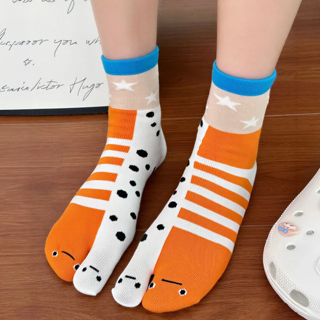 Add instant charm to your outfit with these funny split-toe garden eel socks, designed to bring smiles with every step. Inspired by adorable aquarium eels, this design features warm orange and soft white tones, playful stripes, tiny polka dots, and expressive cartoon faces on each toe. The contrasting patterns on each foot make the socks feel lively and creative, perfect for women who enjoy cute, quirky details in their everyday style.
