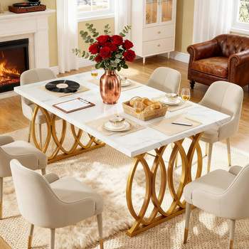 Modern Dining Table for 4-6, White Marble-Like Top with Gold Geometric Legs