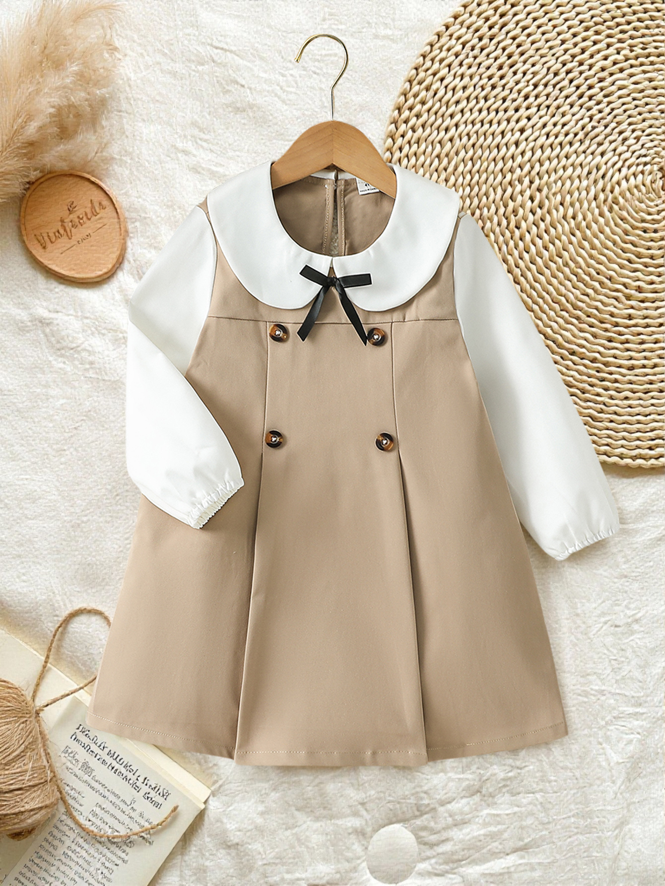 This dress is more than just everyday wear—it’s perfect for birthday parties, family gatherings, school events, or holiday celebrations. Its elegant design paired with playful details makes it a versatile choice that can be dressed up with cute shoes or paired with tights for added warmth. The charming doll collar and bow accent ensure your child will stand out and feel confident wherever she goes.