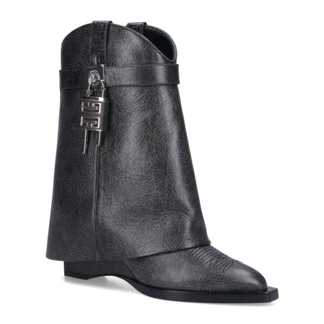 Crafted from premium leather, these Givenchy boots boast a sleek black finish with a distinctive aged and vintage effect. The pointy toe elongates the silhouette, while the 2.3-inch wedge heel adds subtle height without sacrificing comfort. Leather soles ensure lasting durability and elegance, making these boots a staple in any wardrobe. A silver side detail highlights the iconic Givenchy touch, adding a luxurious edge to the design.