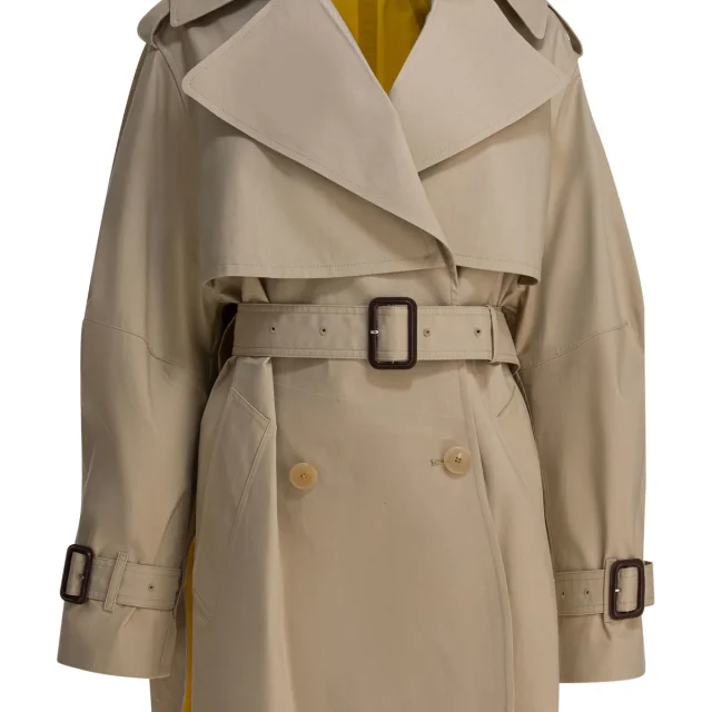 Crafted in 100% cotton, this Givenchy trench coat showcases a classic notched lapel, button closure, and an adjustable, removable belt with a leather buckle. The cape-back detail introduces a unique, fashion-forward element, while side pockets and cuff tabs ensure both practicality and refined aesthetics. Contrasting lining and couture seams create cocoon-like volume, giving this trench coat its iconic and distinctive character.