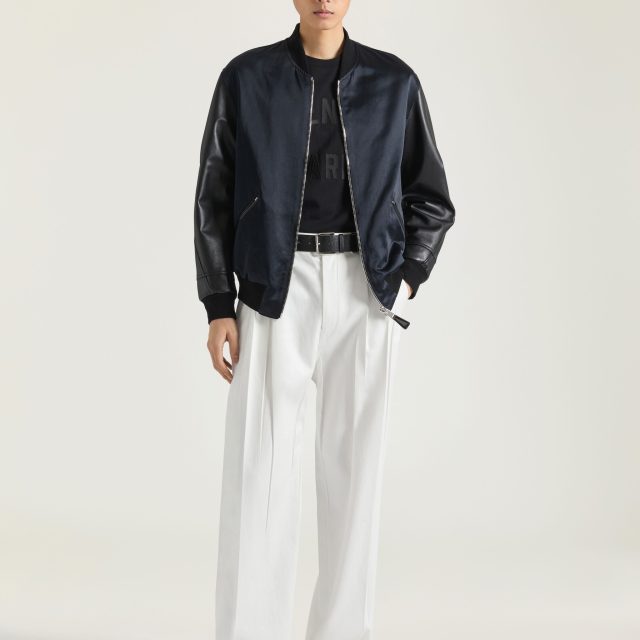 The Givenchy Satin & Leather Bomber Jacket is a statement piece that blends refined craftsmanship with bold design. Designed for those who appreciate modern luxury, this jacket features a smooth satin body paired with soft nappa leather sleeves, creating a striking contrast that stands out in any setting. With its regular fit and timeless silhouette, this jacket is as versatile as it is stylish, making it an essential addition to any high-end wardrobe.