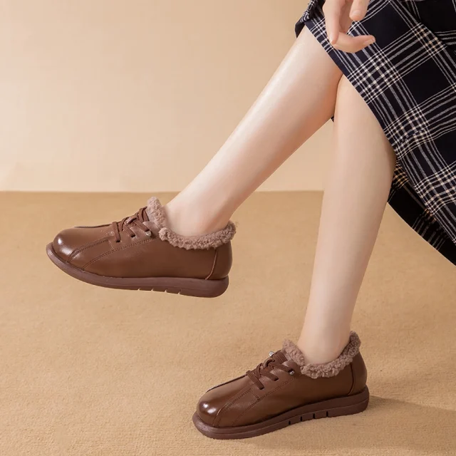 Women’s Winter Genuine Leather Warm Wool Flat Shoes with Soft Sole