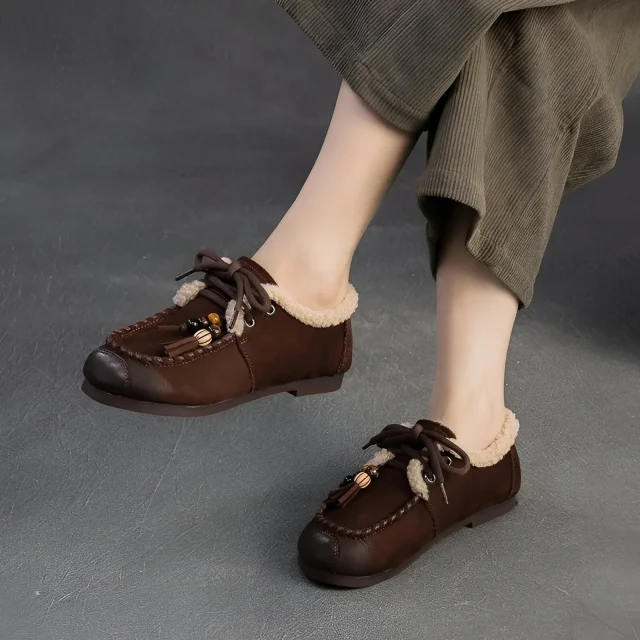 Step into winter with confidence and comfort. These plush-lined leather flats are designed to keep your feet warm while elevating your everyday look. Crafted from genuine cow leather, they offer a soft, flexible feel that molds gently to your feet over time. The retro-inspired lace-up design adds character, while the clean, solid finish makes them easy to pair with almost any outfit. Whether you are heading out for errands or enjoying a relaxed day outdoors, these shoes bring together warmth, style, and ease in one versatile pair.