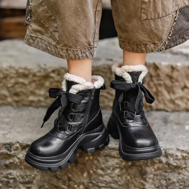 Women’s Leather Ankle Snow Boots with Platform & Warm Plush Lining