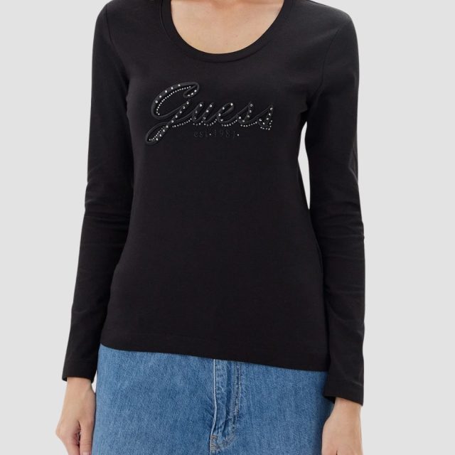 Ready to elevate your wardrobe? Don’t miss out on this stunning piece. Shop now and add the Guess Women’s Black Rhinestone Long Sleeve T-shirt to your collection for a touch of effortless style and shine!