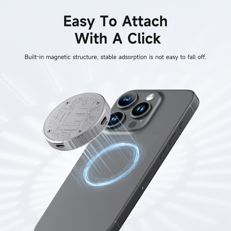 Meet the ultimate solution for creators, professionals, and tech lovers who need lightning-fast data transfer and secure storage on the go. This Magnetic M.2 2230 NVMe SSD Enclosure is designed for those who demand performance, portability, and reliability. With a sleek magnetic design that easily snaps onto MagSafe-compatible devices, it’s perfect for your iPhone, MacBook, or any USB-C gadget. Capture, store, and transfer high-resolution videos, photos, and projects in seconds — without worrying about space or speed.