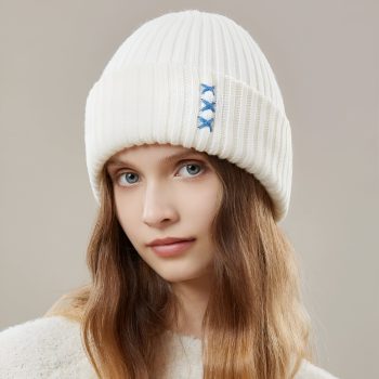 Women’s Winter Wool Ribbed Knit Beanie with Contrast Cross Embroidery