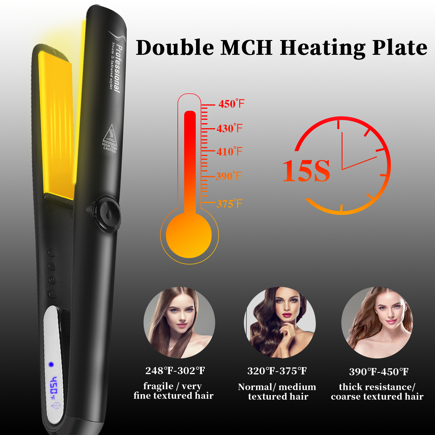 Equipped with an MCH heating core, the ceramic tourmaline plates heat up in just 30 seconds, saving you time on busy mornings. The LCD display lets you easily adjust the temperature between 250℉ and 450℉, so you can customize the heat for your hair type—gentle for fine hair, medium for normal textures, and high for thick or resistant strands. With a 60-minute automatic shut-off, 360° swivel cord, and worldwide dual voltage, it’s built for safety, convenience, and travel.