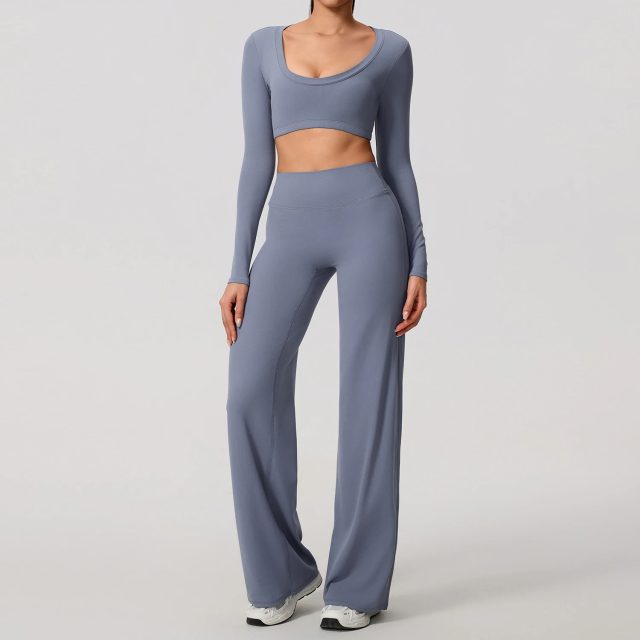 Meet the workout set designed to move with you and flatter you from every angle. This two-piece fitness set combines a sleek long sleeve backless top with high-waist wide leg pants for a look that feels as good as it looks. Whether you are flowing through yoga poses, powering through Pilates, or styling it for an athleisure day out, this set delivers comfort, confidence, and modern style in one easy outfit.