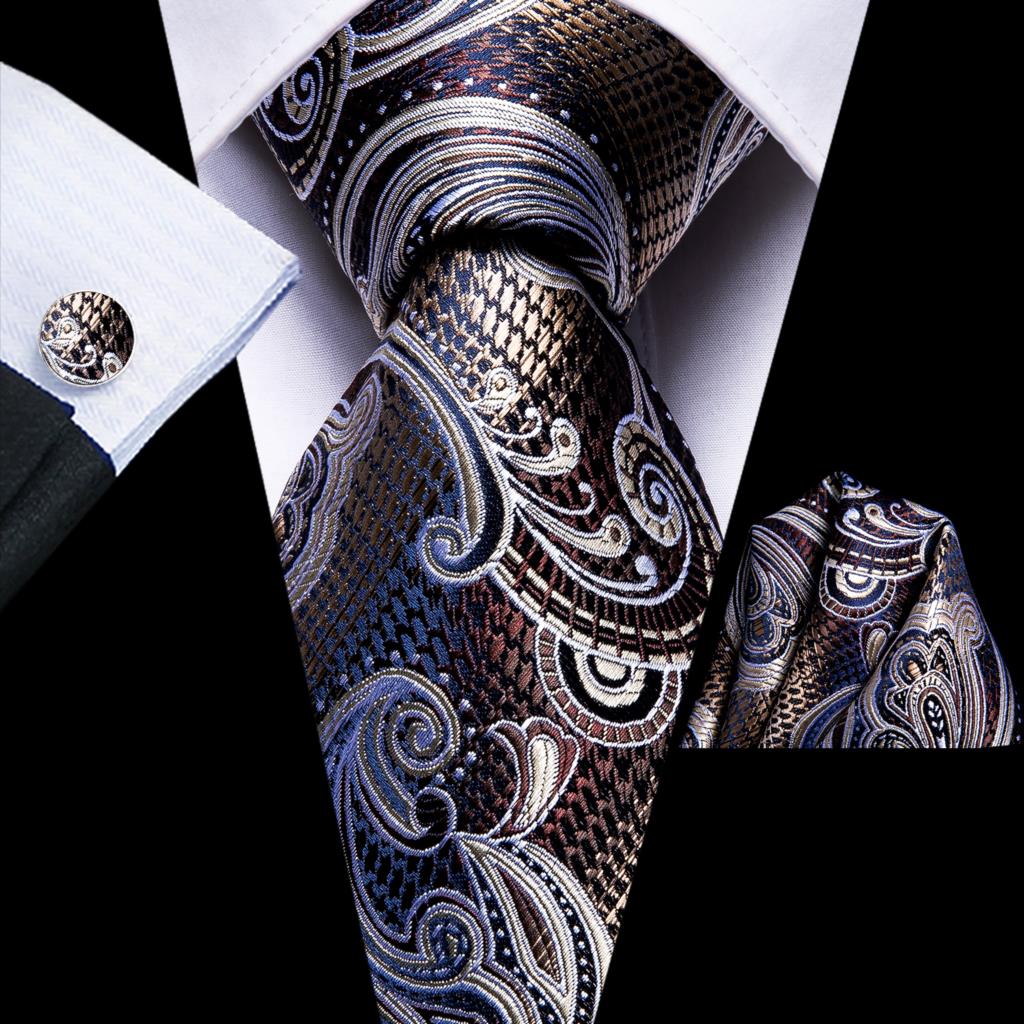 Brown Paisley Silk Tie Set with Pocket Square & Cufflinks