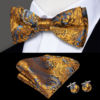 Step into any room with confidence and timeless elegance. This luxurious silk bow tie set brings together a perfectly pre-tied bow tie, a matching pocket square, and a pair of sleek cufflinks. Designed with a refined paisley floral jacquard pattern, this set is a complete accessory solution for men who want to look polished without the hassle of complicated styling. Crafted from smooth, high-quality silk, it feels soft to the touch while offering a subtle sheen that enhances any formal or semi-formal look.