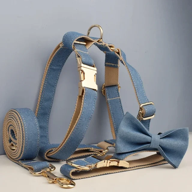 Upgrade your dog’s daily walks today—add this denim collar, leash, and harness set to your cart and let your pup shine in style!