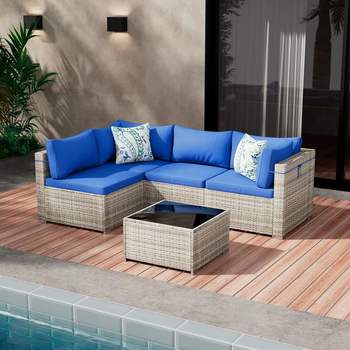 All-Weather Grey 5-Piece Outdoor Wicker Sectional Sofa Set with Glass Table and Blue Cushions