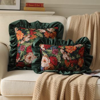 Velvet Ruffle Floral Cushion Cover – Orange & Dark Green Vintage Accent Pillow