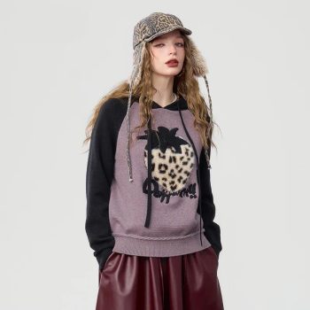 Winter Hooded Knit Sweater with Strawberry Leopard Print