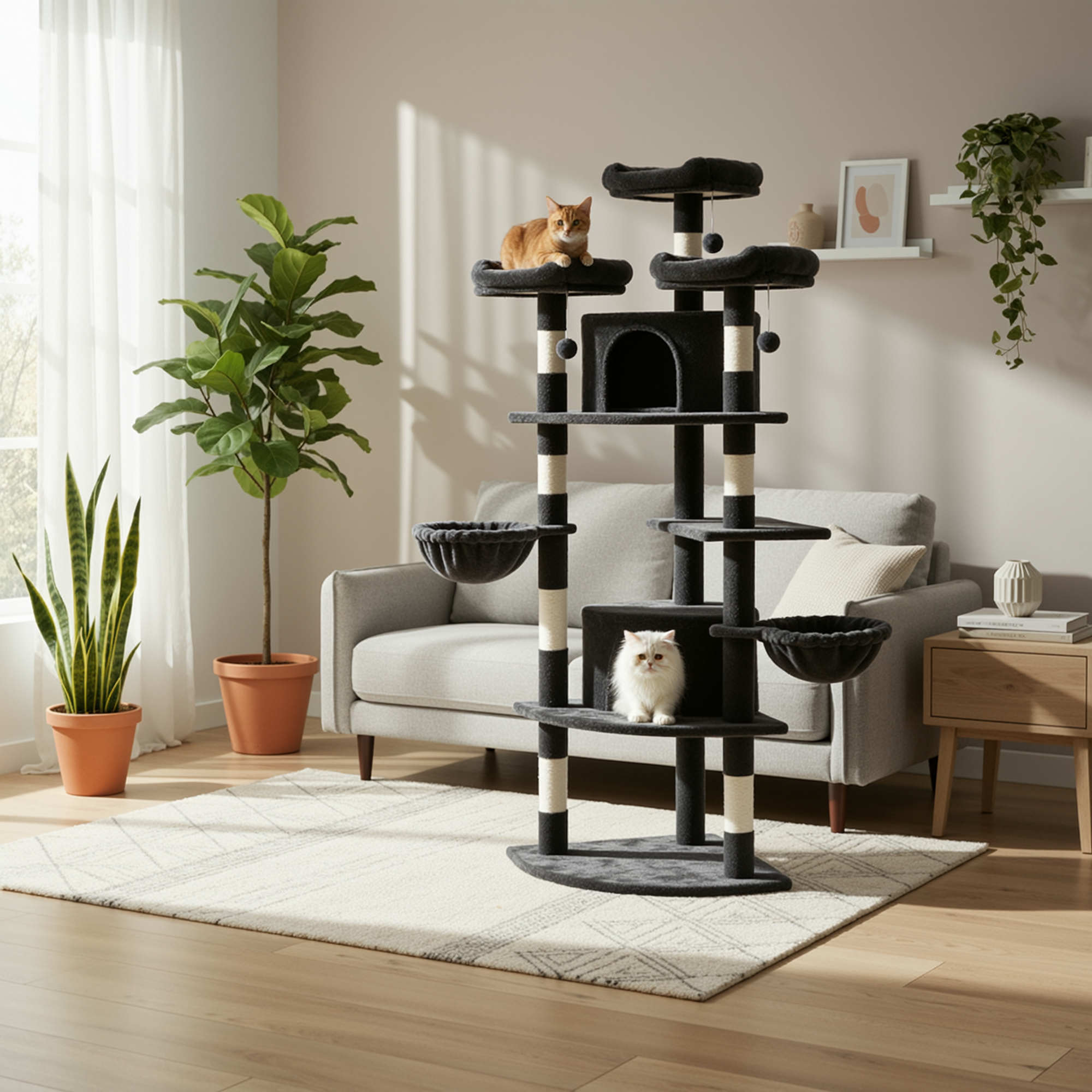 This multi-level cat tree is best used daily as a central spot for playtime, scratching, and rest. It keeps indoor cats active, reduces boredom, and gives them their own space to relax. With multiple platforms, cozy perches, and a lounging basket, it is ideal for single-cat homes or households with multiple cats who like to share.