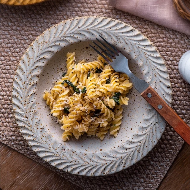 Crafted from high-quality ceramic, this plate combines durability with timeless style. The embossed leaf pattern adds depth and visual interest without overwhelming your table setting. Its round form offers generous space for presentation, making it ideal for Western-style meals, soups, salads, pasta, or shared dishes. The smooth glazed surface enhances colors and textures of food, making every dish look more appetizing and professionally plated.