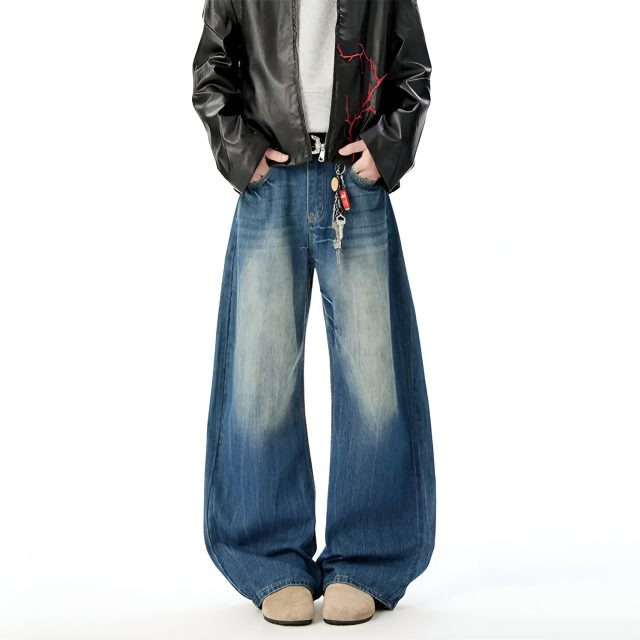What sets these jeans apart is their unique curved-knife cut combined with a wide-leg profile. This design creates a strong visual flow down the legs, making your outfit look more structured while still relaxed. The contrast washing adds depth and character, so they do not look flat or boring like standard denim.