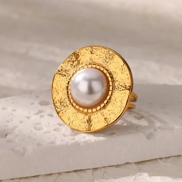 Whether you’re treating yourself or gifting it to someone special, this ring offers a versatile and stylish look that complements any outfit. From casual gatherings to formal events, this adjustable ring will make a statement that will turn heads wherever you go. With its geometric design and shiny pearl inlay, it’s the ideal piece to elevate your fashion game.