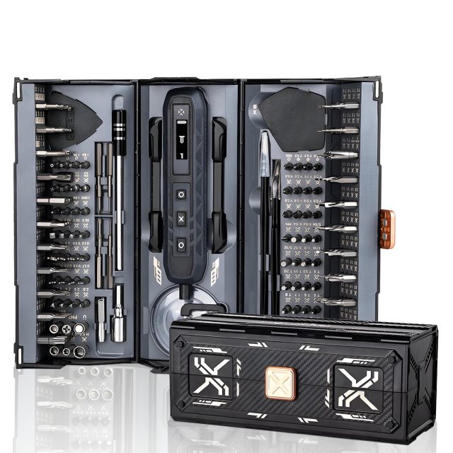 With its futuristic capsule design, white body accented with gold, and a compact 8.3 x 3.5 x 3.1-inch case, this kit fits easily in a backpack, toolbox, or drawer. Despite its small size, it holds more than a hundred accessories neatly organized for quick access. From delicate electronics to small furniture and toys, this kit is ready for any task you throw at it.