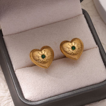 Green Zircon Heart Stripe Stud Earrings – Gold Stainless Steel for Women