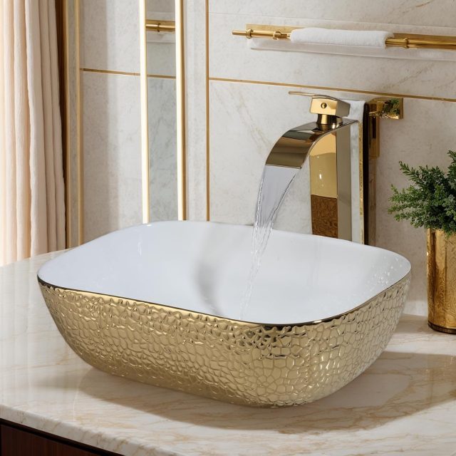 Transform your bathroom into a luxurious retreat with this high-end square ceramic sink set. Featuring a radiant golden finish and sleek geometric design, this countertop basin instantly elevates any modern or classic décor. Its sophisticated style creates a stunning centerpiece, perfect for those who appreciate the finer details in interior design. Whether you’re remodeling your master suite or upgrading a guest bath, this sink offers both beauty and functionality.