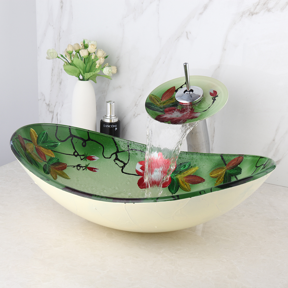 Transform your bathroom into a personal art gallery with this stunning hand-painted glass basin and waterfall faucet set. Each bowl is carefully crafted by hand, making every piece a one-of-a-kind work of art. The luxurious, oversized design and rich color details bring elegance and sophistication to any contemporary or traditional bathroom space. Whether you’re refreshing a guest bath or creating a spa-like retreat, this artistic basin makes an unforgettable centerpiece.