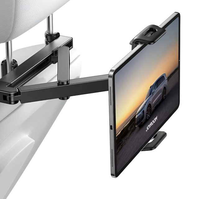 The extendable arm lets you adjust the viewing distance and angle with ease, so everyone can find their ideal position. Its smart folding design allows the holder to lay flat when not in use, keeping your car interior neat and safe. Built with a reinforced triangular structure and strong metal components, it stays firmly in place even on bumpy roads, giving you peace of mind throughout the ride.
