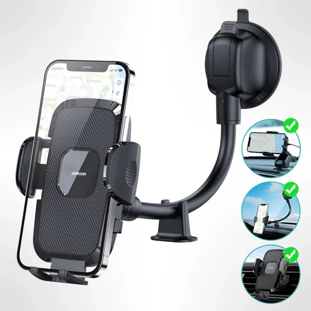 This upgraded car phone holder features a powerful suction cup base with industrial-grade stickiness for a rock-solid grip. The flexible gooseneck arm brings your phone closer, offering easy touch access without obstructing your view. With anti-shake stabilization and a U-shaped support structure, your phone stays steady even on bumpy roads. Crafted from durable ABS+PC materials, this holder delivers both strength and style.