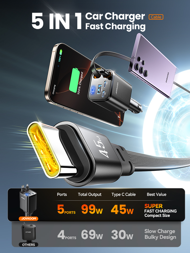 Experience the future of in-car charging with the Retractable 99W Fast Car Charger USB-C Adapter. Designed for both Apple and Android devices, this premium charger delivers unmatched power and convenience on the road. Its ultra-compact design fits perfectly in any car, offering a sleek and clutter-free solution for your charging needs.