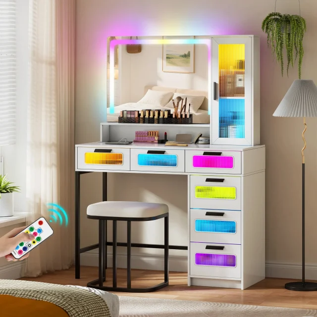 This vanity desk is more than just furniture—it’s a statement of style and self-expression. Use it daily to prepare for work, special occasions, or a relaxing night routine. The RGB lighting lets you set the tone for any moment, while the built-in charging station keeps your essentials ready to go. With generous storage and a clean, elegant design, it’s perfect for anyone who loves organization, beauty, and a touch of luxury at home.