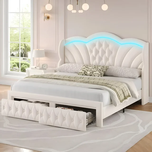 The tall, tufted headboard gives this bed a luxurious, cloud-like appeal. Upholstered in thick velvet fabric and filled with high-density foam, it offers a silky-soft surface that feels as good as it looks. The diamond stitching and elegant curves add a refined touch, making it ideal for modern, classic, or glam-inspired interiors.