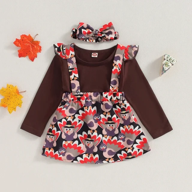 Get your little one ready for the cozy fall season with this Girls 3-Piece Thanksgiving Outfit Set. Designed with love and attention to detail, this charming ensemble includes a soft solid-color long sleeve T-shirt, a festive turkey print suspender skirt, and a matching headband for the perfect finishing touch. It’s the ideal outfit for Thanksgiving gatherings, fall photoshoots, or any autumn celebration.
