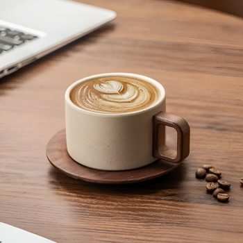 Vintage Ceramic Coffee Cup with Wooden Handle & Saucer – 8.5 oz Large Capacity