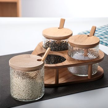 Transparent Glass Seasoning Jar Set with Wooden Lid, Spoon & Acacia Tray