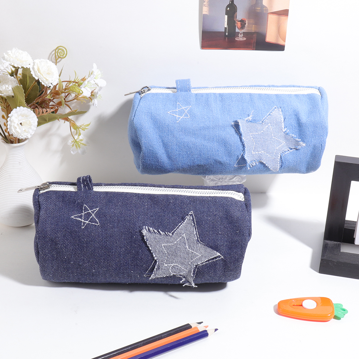 Korean Denim Star Pencil Case – Cute Aesthetic School Supply Organizer