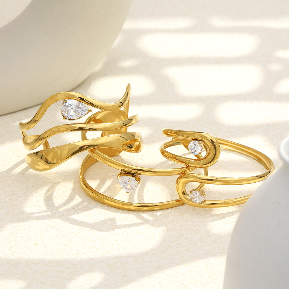 This open cuff bracelet is not just a piece of jewelry—it’s a statement of style, sophistication, and quality. The combination of 316L stainless steel and 18K gold plating ensures a bracelet that feels luxurious without sacrificing durability. The water drop zircon stones catch the light beautifully, adding a touch of glamour to your look. Plus, with its hypoallergenic properties, it’s suitable for even the most sensitive skin.