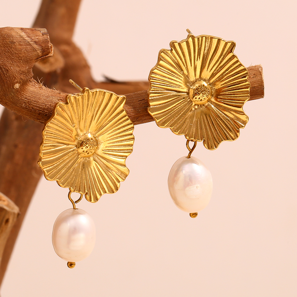 Crafted from durable 316L stainless steel and finished with rich 18K gold plating, these earrings are built to keep their shine. The lace-inspired metal design highlights the round freshwater pearl, creating a graceful vintage-inspired look that feels timeless yet fresh. Measuring approximately 0.94 x 1.67 inches and weighing about 0.43 oz, they offer a noticeable presence without feeling heavy.