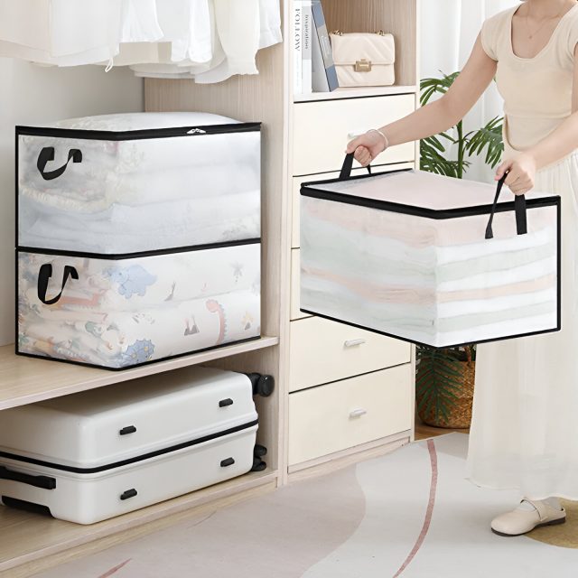 This storage bag combines durability, visibility, and portability in one smart design. The waterproof PVC material helps protect your items from dust, moisture, and daily wear. The transparent window allows you to instantly identify what’s inside without opening the bag, saving you time and effort. With sturdy handles, you can move your stored items easily from room to room. Measuring generously in size, it fits large blankets, bulky winter coats, pillows, towels, and more—making it ideal for seasonal storage, home organization, or travel.