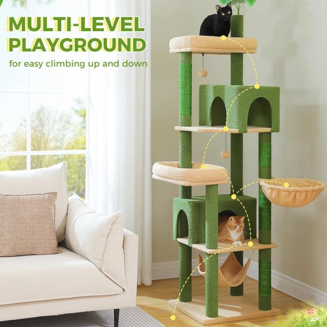 Unlike ordinary cat furniture, this tower combines fun, comfort, and safety in one. The sturdy wooden build supports even large cats, while the plush perch and hammock provide ultimate comfort. Multiple tiers mean multiple cats can enjoy it at once without crowding. Plus, the natural sisal scratchers encourage healthy claw activity and save your furniture from damage. It’s the ideal indoor playground for active kittens, playful adults, or relaxed seniors.