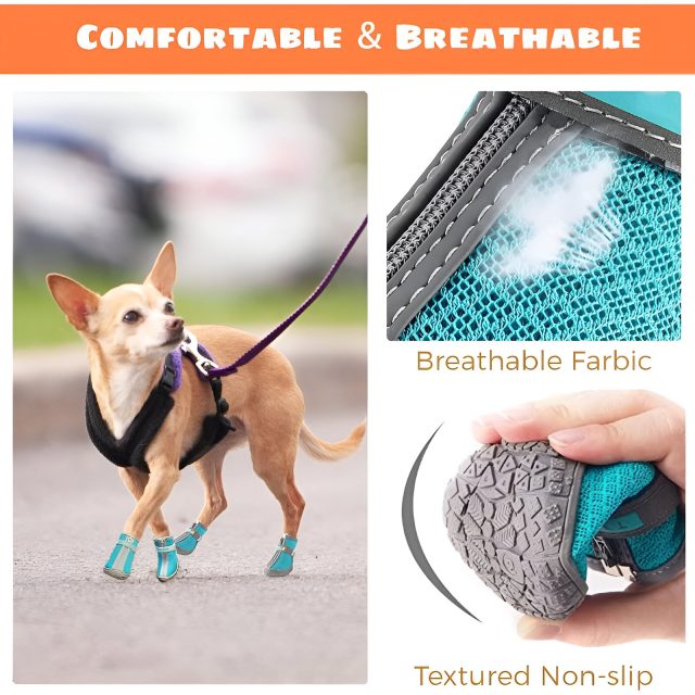• High-Quality Materials: Made from a combination of breathable mesh fabric, dust-proof microfiber, and a sturdy rubber sole, these boots provide both comfort and durability. The mesh ensures good airflow while protecting your dog’s paws from dirt and debris.