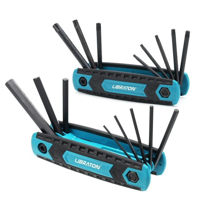 This folding set includes eight metric hex keys ranging from 0.06 in to 0.31 in, plus eight tamper-proof torx sizes from T-9 to T-40. Each piece folds neatly into a slim, sturdy handle, keeping everything organized and ready when you need it most. The non-slip grip ensures stable handling, even in tight spaces or when working at awkward angles. Flexible heads offer more workable angle options, making it easy to reach fasteners that standard straight keys can’t access.