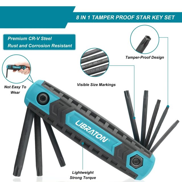 Libraton 8 in 1 Tamper Proof Star Key Set (Folding) Security Torx Key Set Sizes Include T-9 to T-40, CR-V Steel Metric