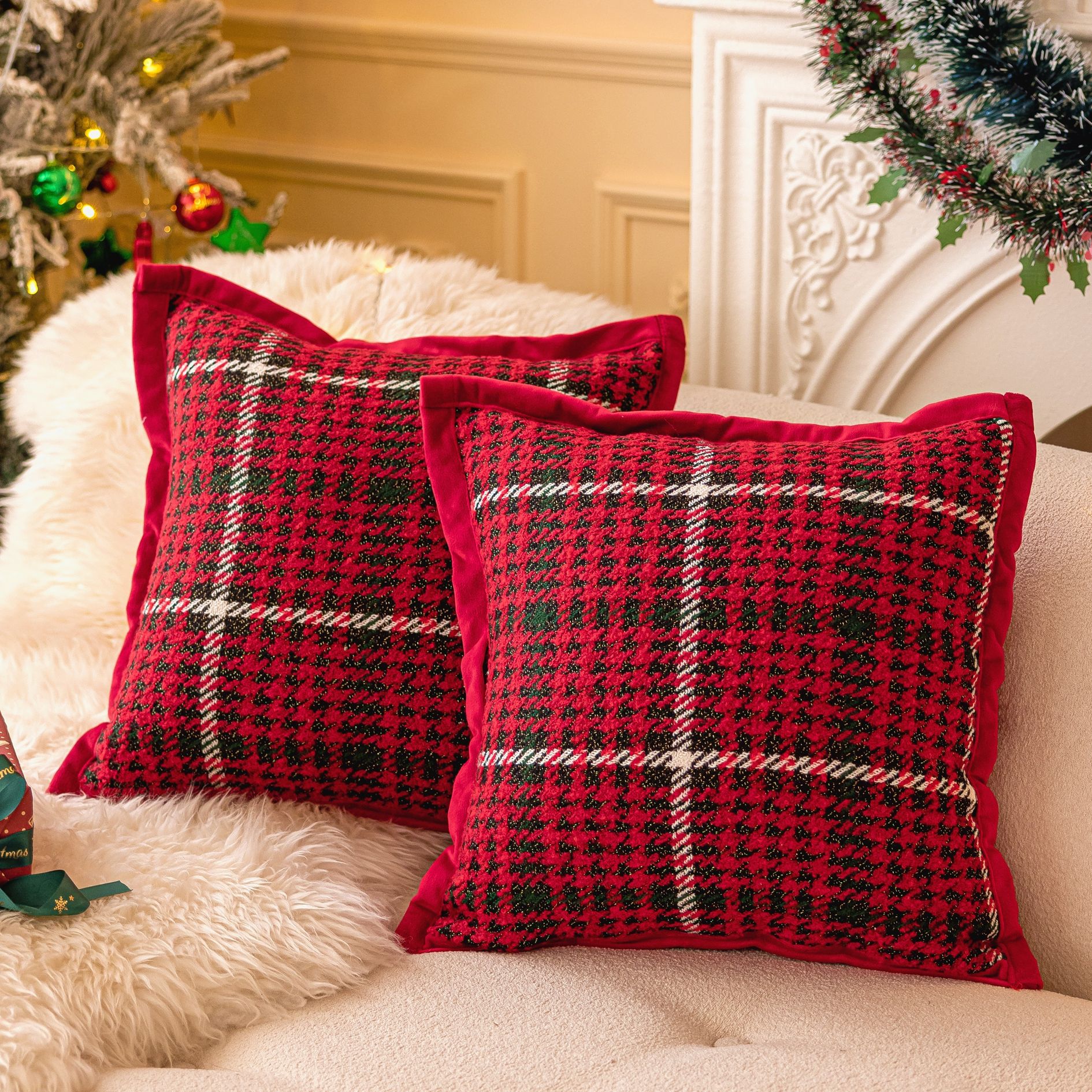 Add a warm, festive touch to your home with this Light Luxury Christmas Plaid Sofa Pillow Cover. Designed in a classic red plaid pattern and finished with a charming three-dimensional flower detail, it brings a perfect blend of comfort, elegance, and holiday cheer to any space. Crafted from smooth, durable polyester, this 18×18 inch pillow cover feels soft to the touch while standing up beautifully to everyday use. Whether placed on your sofa, bed, or bay window, it instantly enhances the atmosphere and makes your home feel more inviting.