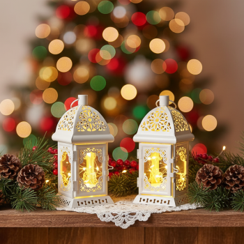 Vintage White Metal Candle Lantern Set with LED Fairy Lights – 2 Pack