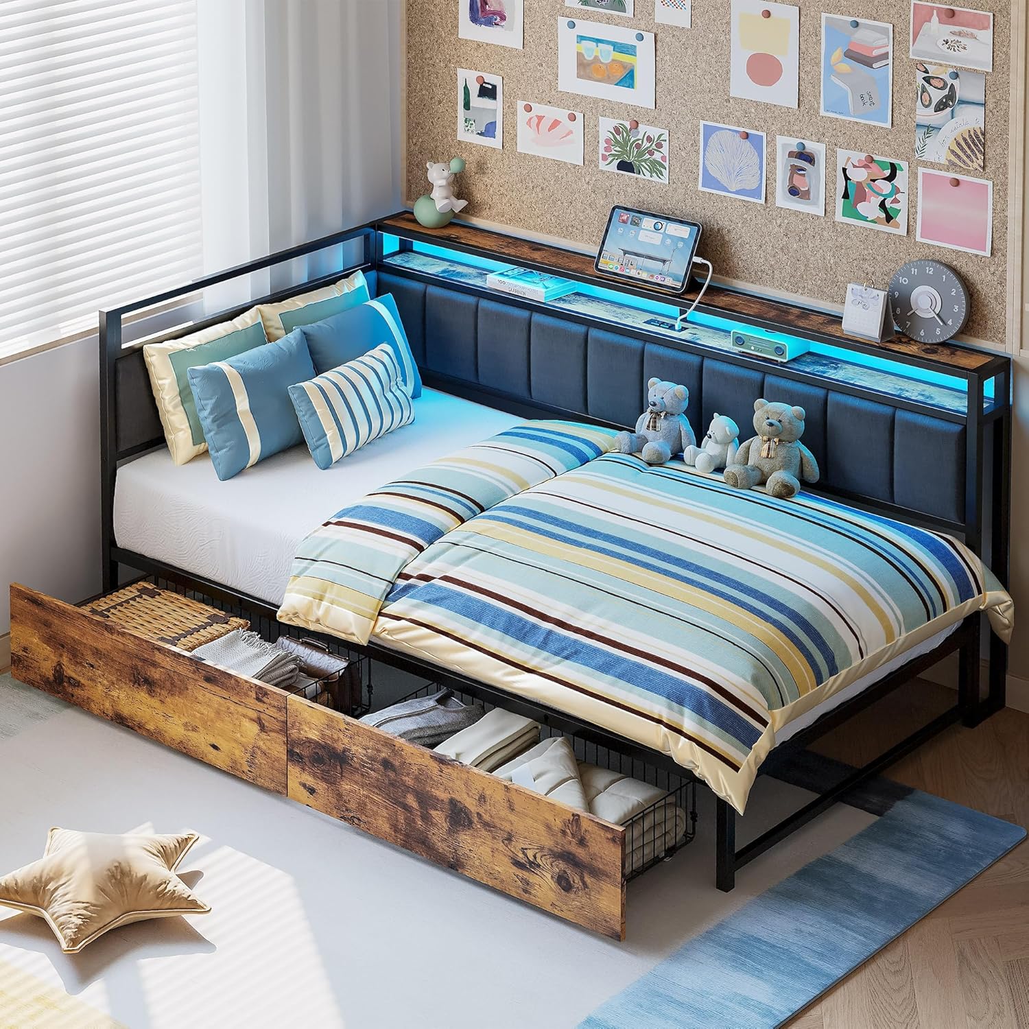 Maximize every inch of your room with this sleek Corner Daybed with Storage Drawers, LED Lights & Charging Station. Designed to fit perfectly into any corner, this modern L-shaped metal bed frame blends comfort, practicality, and aesthetics in one smart design. Whether used in a bedroom, guest room, or studio apartment, it easily switches from cozy seating by day to a restful sleeping space at night—ideal for small spaces and multipurpose rooms.