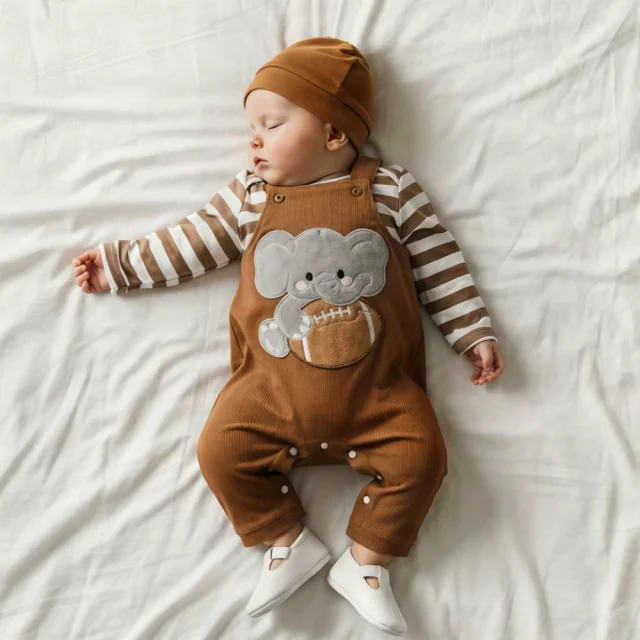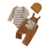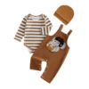 Dress your little one in a look that melts hearts and keeps him comfy all day long. This charming baby boy 3-piece outfit set includes a long sleeve striped romper, cute elephant embroidered overalls, and a matching hat for a perfectly coordinated look. Designed for both style and practicality, it’s an outfit parents love and babies feel great wearing.