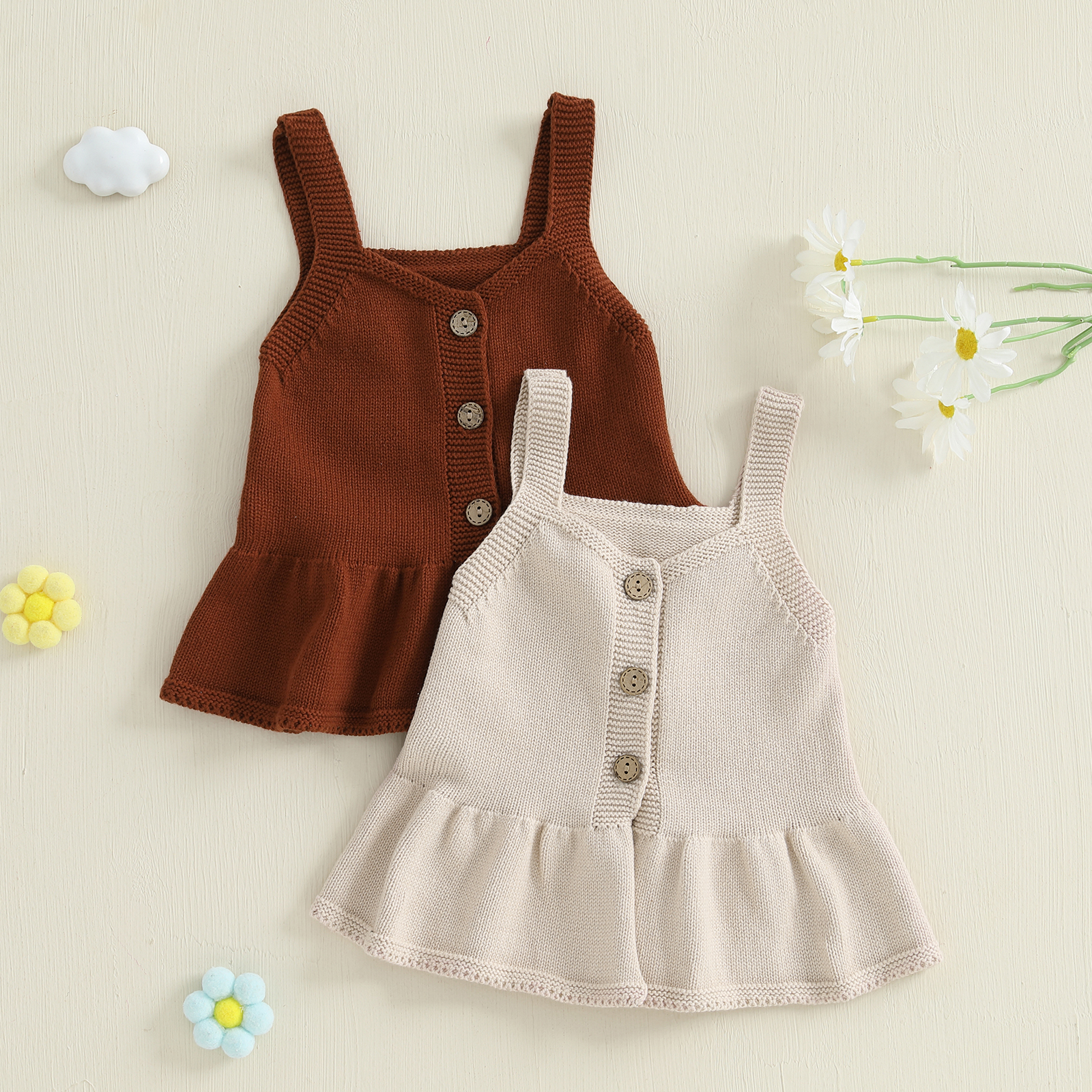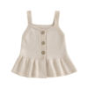 Dress your baby girl in effortless charm with this adorable knitted cami top. Made with soft, breathable fabric, this sleeveless sweater cardigan is designed to keep your little one comfortable while looking stylish all season long. The solid color and elegant V-neckline add a timeless touch, while the ruffled hem brings a playful and sweet detail perfect for every outing. Whether it’s layered for cooler days or worn alone in milder weather, this cardigan is a must-have in her wardrobe.